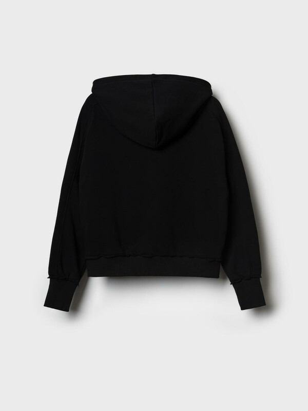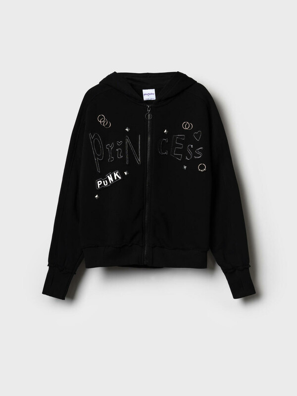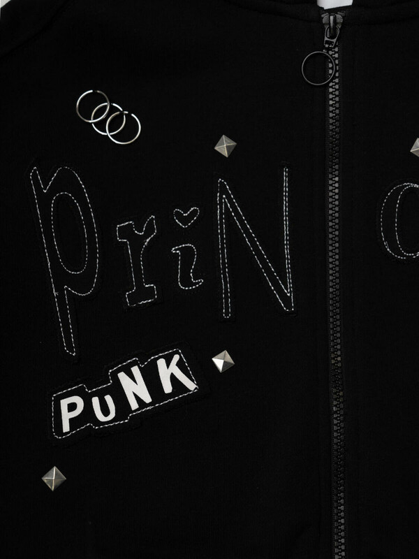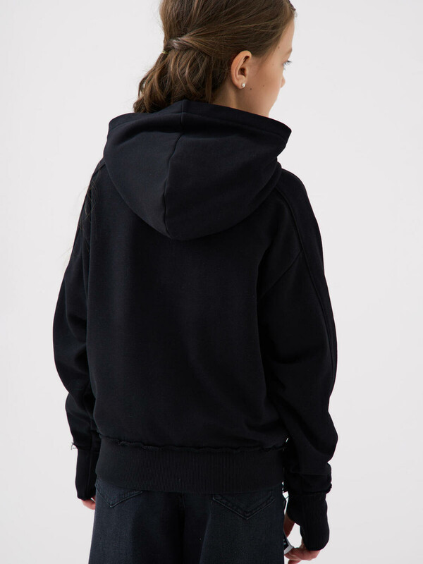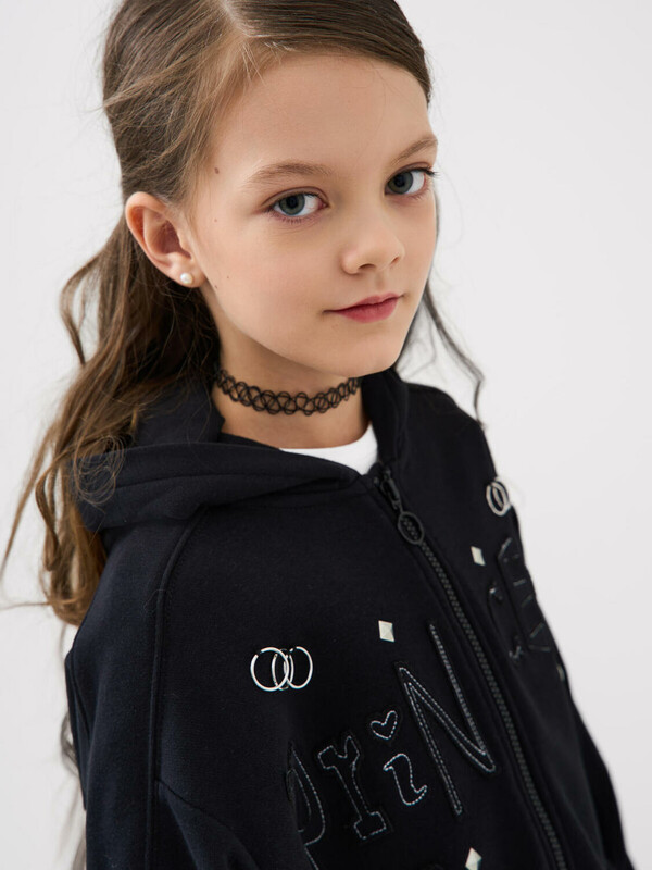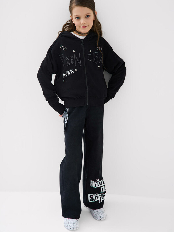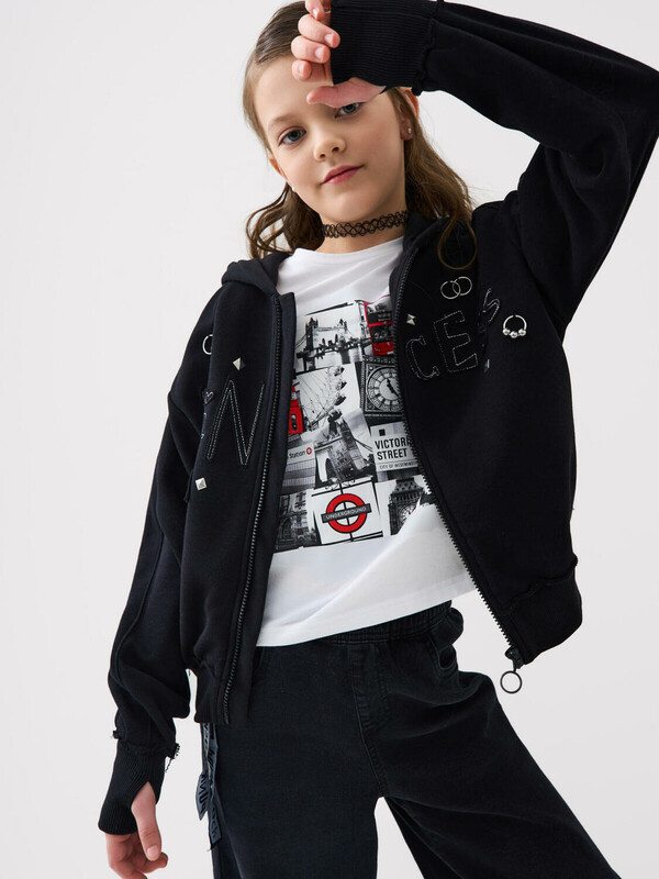 Толстовка оверсайз на молнии для девочки подростка. Выполнена из хлопкового футера без начеса. На передней части — выразительный принт. Капюшон. Два удобных боковых кармана. Низ изделия и рукава оформлены эластичными резинками.