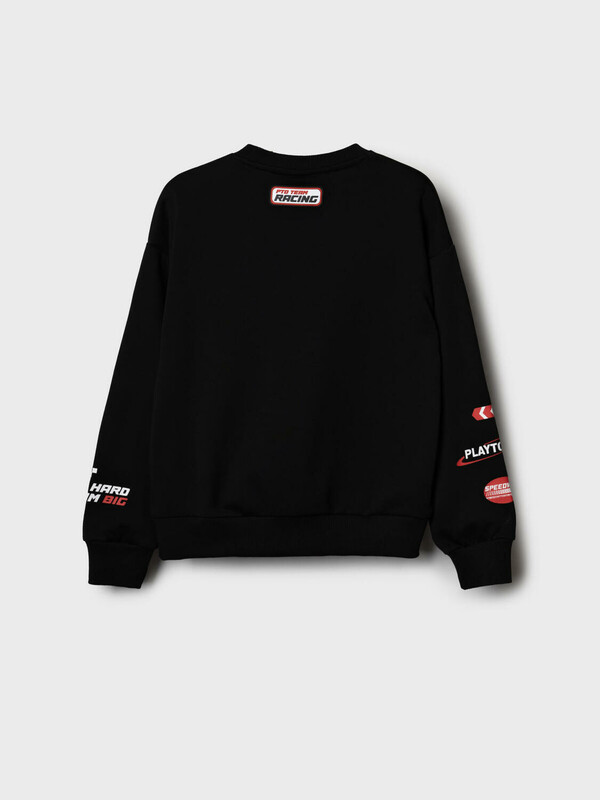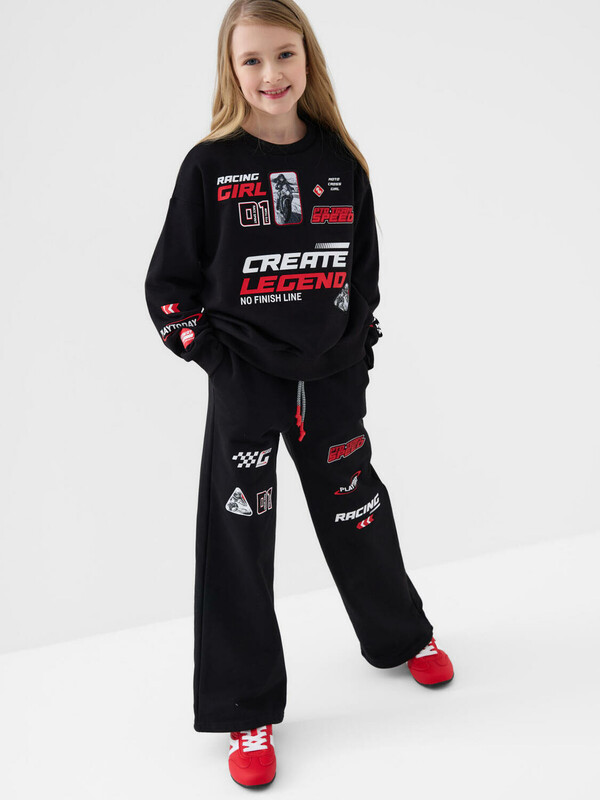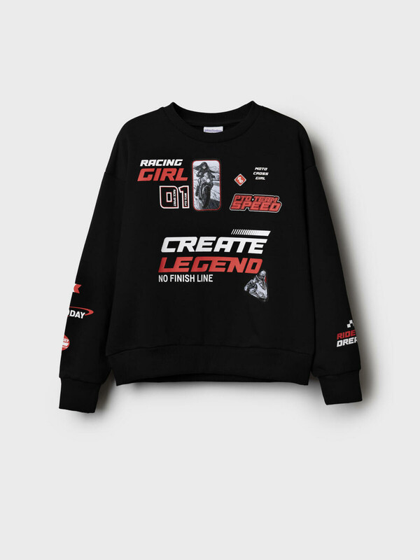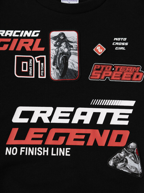 Свитшот оверсайз для девочки подростка. Выполнен из хлопкового футера без начеса. На передней части — выразительный принт в гоночной тематике. Низ изделия и рукава оформлены эластичными резинками.