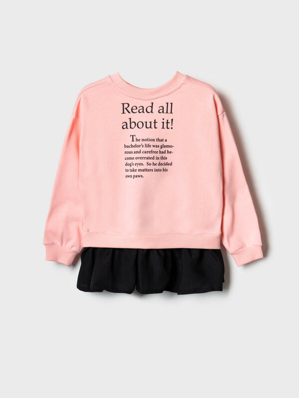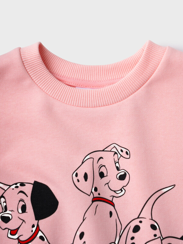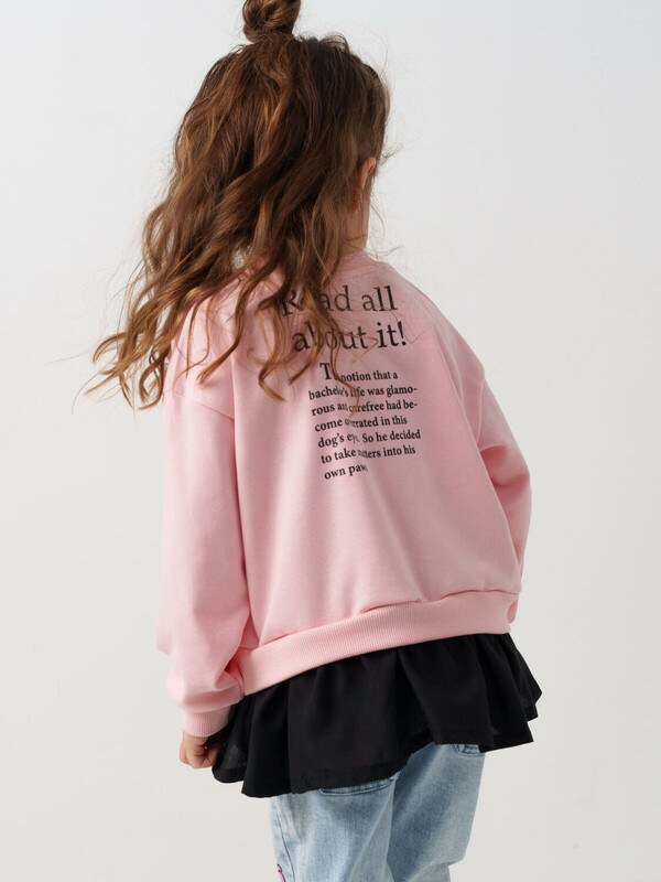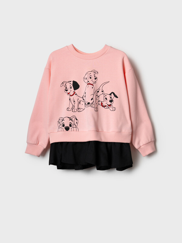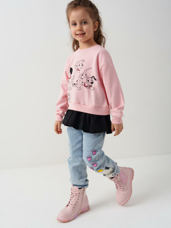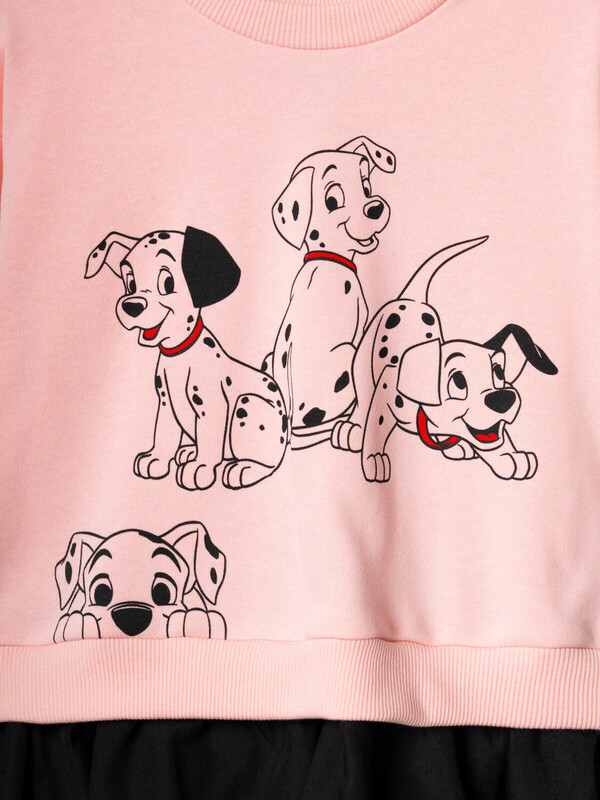 Детский свитшот для девочки. Выполнен из хлопкового футера без начеса. Спереди - принт с любимыми мультяшными героями из "101 далматинец". На спинке размещён крупный текст. Особенность модели — декоративная "юбка", пришитая по нижнему краю, которая создаёт эффект платья. Горловина, манжеты и низ изделия собраны на эластичную резинку.