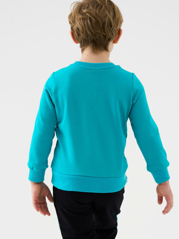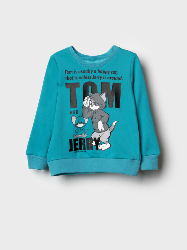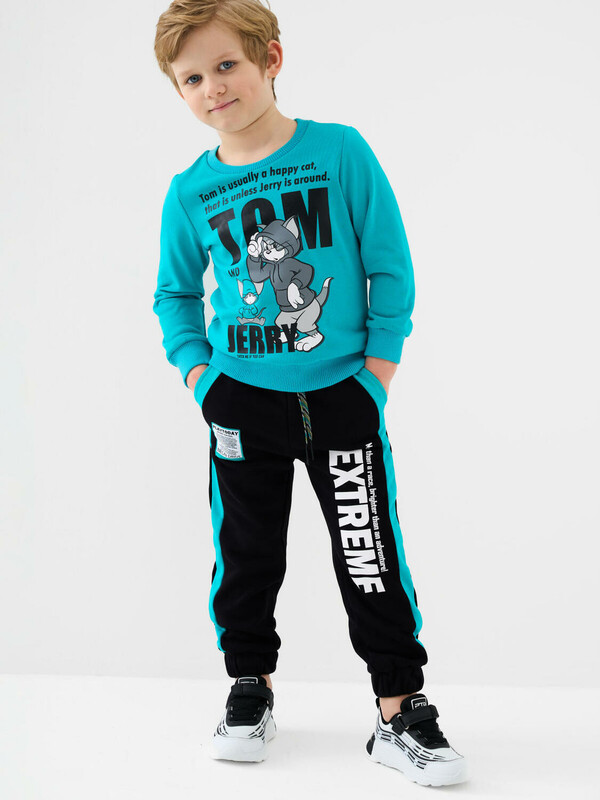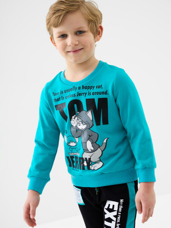 Детский свитшот для мальчика. Выполнен из хлопкового футера без начеса. Спереди — яркий принт с любимыми героями из мультфильма "Том и Джерри". Горловина, манжеты и низ изделия выполнены из эластичного риба, что обеспечивает комфортную посадку.