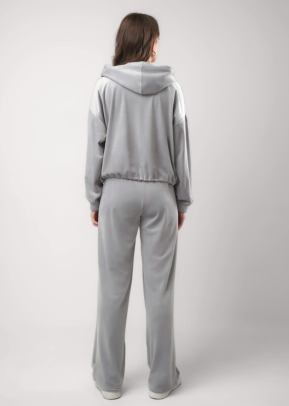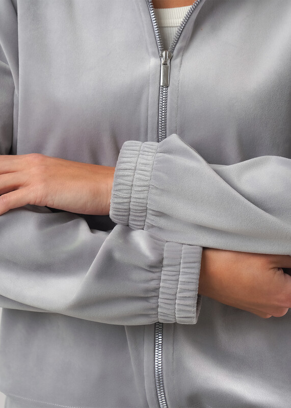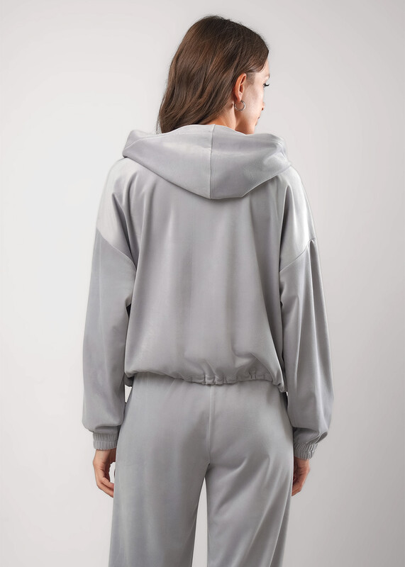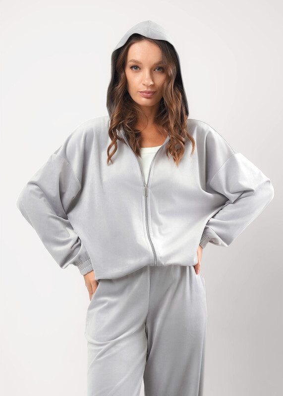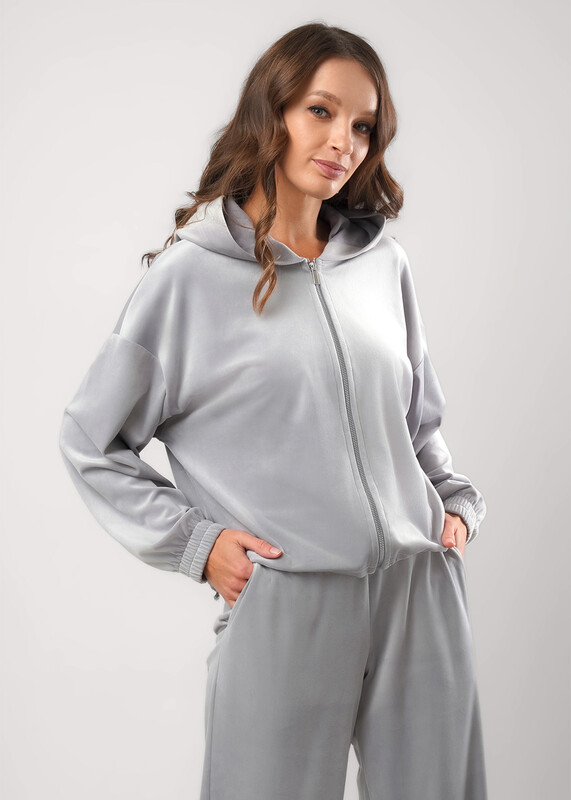 Куртка на молнии свободного силуэта из трикотажного полотна велюр, с капюшоном на подкладе. Длинный рукав со спущенной линией плеча, по низу подгибка с внутренней резинкой. По низу изделия кулиса со шляпной резинкой и стопором.