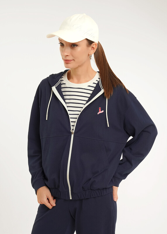 Куртка- бомбер из трикотажного полотна пике с застежкой на молнию, умеренного объема, с капюшоном. Длинный рукав со спущенной линиией плеча. По переду рельефы, карманы в швах. По низу рукава и изделия манжет со вставкой из резинки.