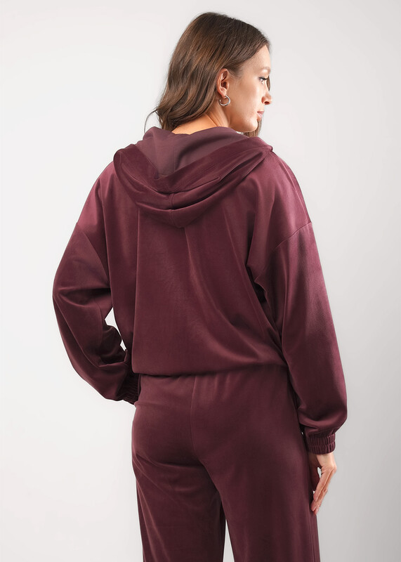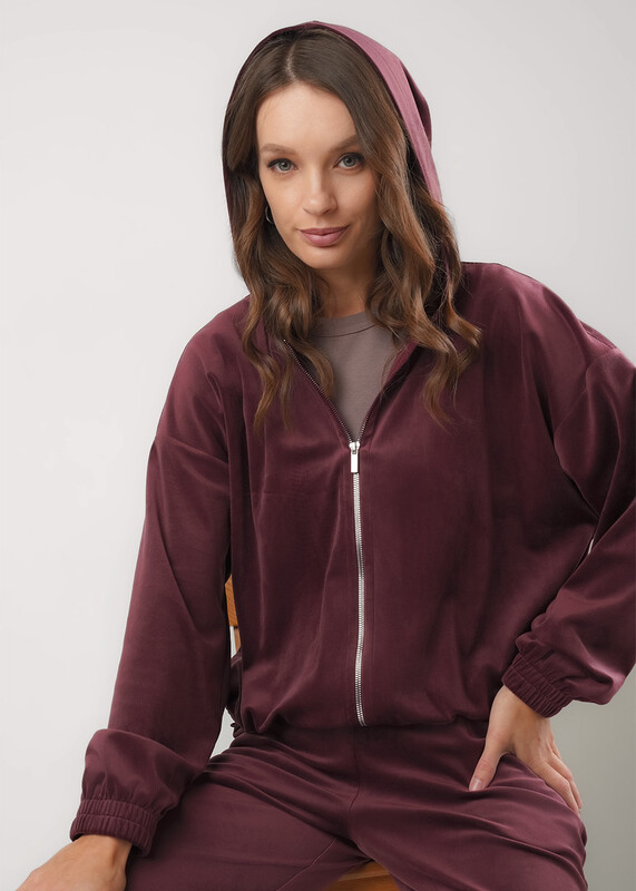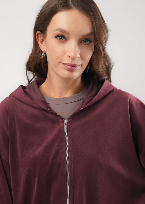 Куртка на молнии свободного силуэта из трикотажного полотна велюр, с капюшоном на подкладе. Длинный рукав со спущенной линией плеча, по низу подгибка с внутренней резинкой. По низу изделия кулиса со шляпной резинкой и стопором.