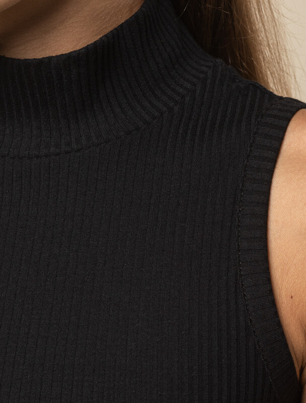 Топ с воротом стойкой выполнен из трикотажа в широкий рубчик. Премиальное качество хлопковых волокон и наличие эластана в составе изделия способствуют идеальной посадке по фигуре не сковывая движений. Изделие сохранит свой безупречный внешний вид в течении долгого времени. Модель хорошо сочетается в многослойных осенних образах, с жакетами и кардиганами.