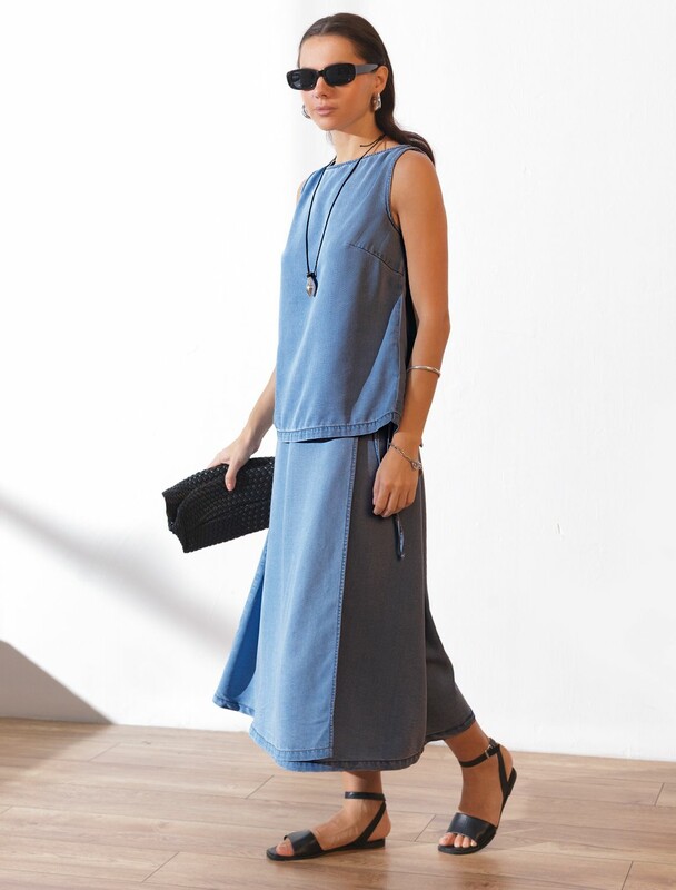 Элегантный топ без рукавов плотностью 7,8 OZ светло-синего цвета станет идеальным выбором для теплого времени года или многослойных ансамблей. Вырез лодочка придает топу утонченность, а асимметричный разрез на спине добавляет необычности и легкой дерзости. Аккуратная контрастная вышивка на спине служит дополнительным украшением и делает изделие более уникальным. Простой прямой крой топа в сочетании с интересными деталями создает стильную и в то же время комфортную вещь. Особенность топа - состав ткани, сочетающая прочность и мягкость лиоцелла с вискозой, что делает её невероятно комфортной, дышащей, устойчивой к сминанию и идеально подходящей для чувствительной кожи. Благодаря нежным тактильтным ощущениям, будто шелк, от которого ощущается приятная прохлада, повседневный топ подойдет на жаркое лето. Топ подойдет для любительниц базовой одежды, которые хотят деликатно повысить градус своего стиля.