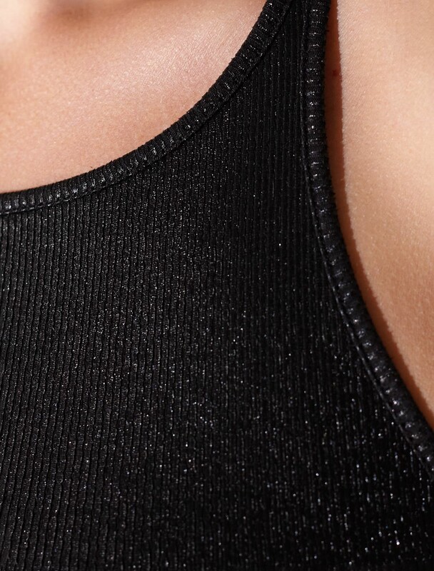 Эффектный топ черного цвета из мягкого хлопка с эластаном представлен в стильном исполнении с матовым покрытием металлик. Мелкий рубчик визуально вытягивает силуэт и подчеркивает фигуру, делая образ более стройным и аккуратным. Круглый ворот и суженные лямки акцентируют внимание на линии ключиц, делая образ утонченным и изысканным, Благодаря деликатному блеску топ подходит для тех, кто ценит утонченность и стремится добавить в образ немного сияния без перебора -  это отличный вариант топа для любительниц минимализма.