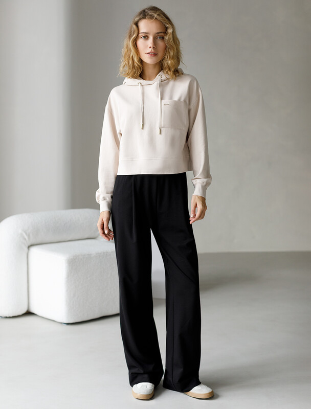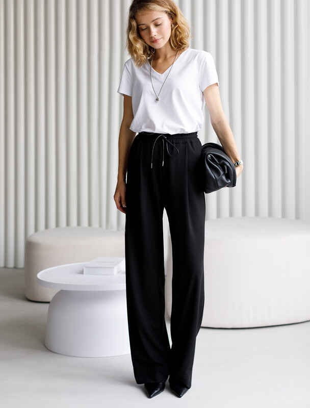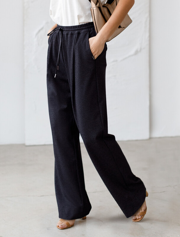 Свободные брюки из трикотажного костюмного полотна. Эластичный пояс на резинке с регулируемым шнурком из эко-кожи комфортно фиксирует изделие на талии. Модель дополнена двумя боковыми и задним карманами.