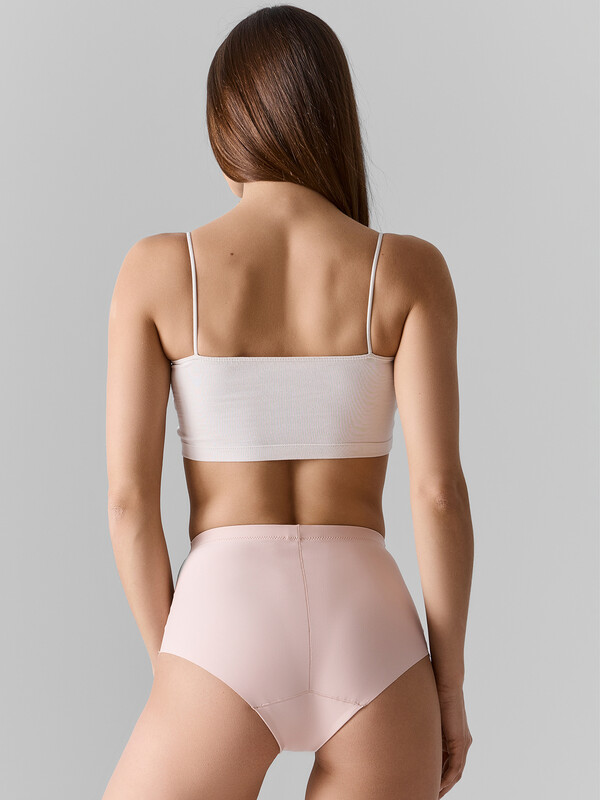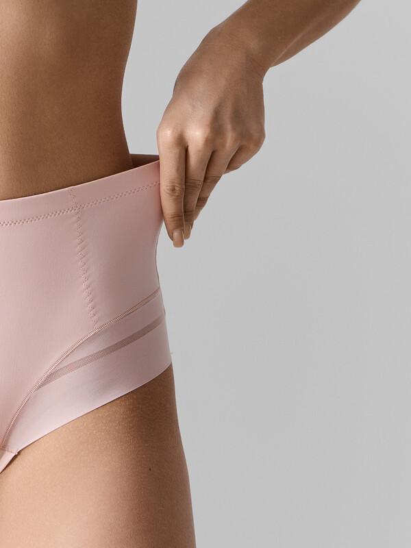 Трусы женские макси с высокой посадкой силуэта «слип», корректирующие, выполнены из микрофибры и эластичного кружева. Нижние передние детали - из эластичного кружева. Деталь переда частично (в области живота) на подкладке из кулирного хлопкового полотна. Задняя деталь со средним швом, нижние срезы без обработки (полотно фрикат). Верхний срез трусов обработан эластичной тесьмой 20ммм (жилка вязанная KT1-20, Arteks Em020). Ластовица отрезная, подкладка ластовицы из кулирного хлопкового полотна.