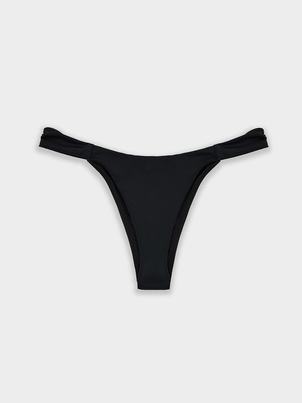 Трусы купальные бразилиана со средней линией талии из гладкой микрофибры на подкладке, с протяжками из полотна по бокам.