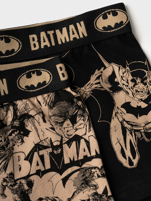 Набор из двух трусов-боксеров для мальчика подростка. Изделие плотно прилегает к телу, не имеет боковых швов, что делает его особенно комфортным. Эластичный пояс с логотипом бренда обеспечивает надёжную посадку. Принт с любимым персонажем - Бэтменом. Материал — мягкий хлопковый трикотаж, приятный к телу.