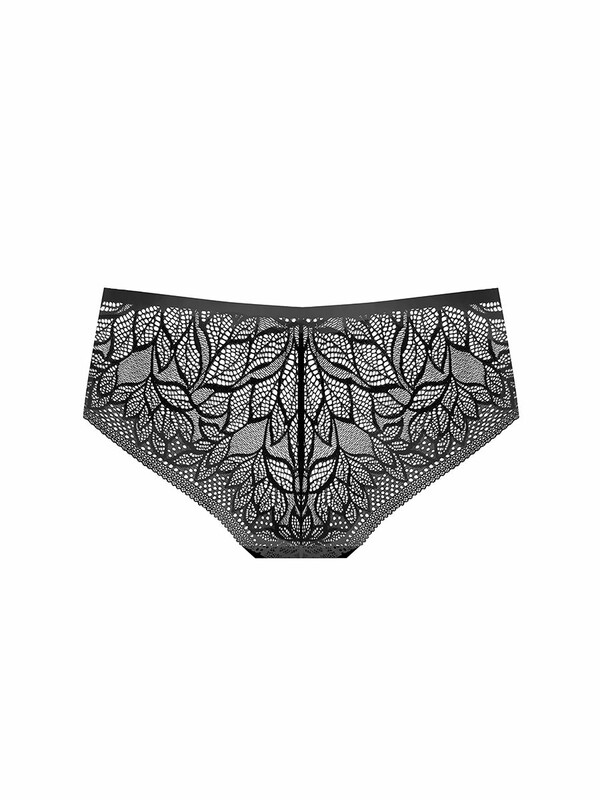 Кружевные трусики модели Hipster со средней посадкой с увеличенным бочком. Нежная резинка по талии. Подгиб и плоский шов по вырезку ножки спереди и кружевное полотно сзади. Ластовица из хлопка. Декоративная металлическая подвеска с заглавной буквой бренда