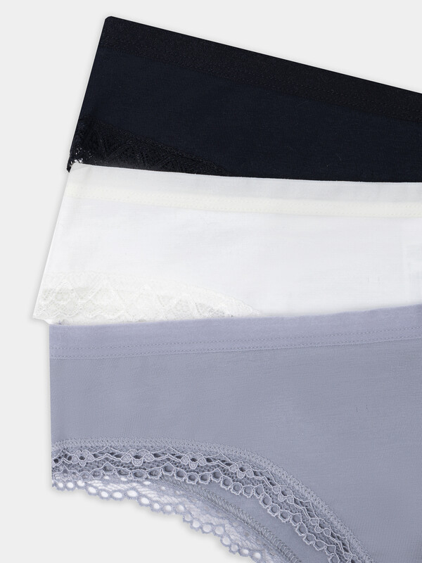 Набор из трех женских трусов-слипов в разных цветах — это идеальное сочетание комфорта и изящных деталей. Модели с невысокой посадкой выполнены из мягкого хлопка с добавлением эластана, который обеспечивает нежное облегание и свободу движений. Изящная кружевная лента по поясу и ножкам добавляет образу женственности, оставаясь комфортной в носке.
