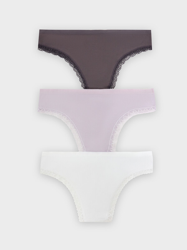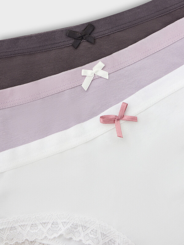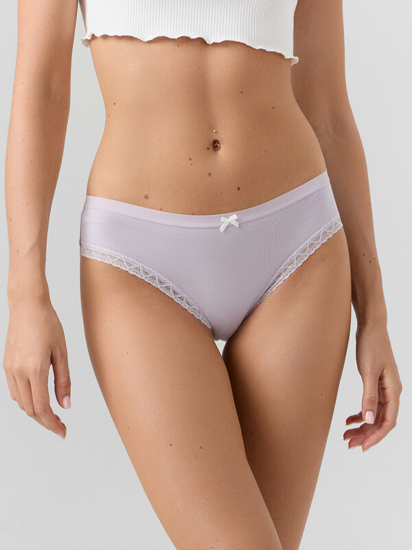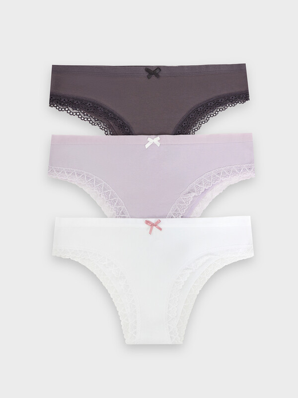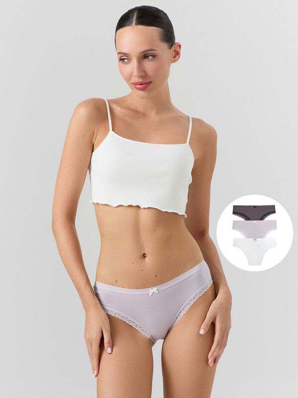 Мультипак (3 штуки) хлопковых слип-бикини из натурального, гипоаллергенного, дышащего полотна. Линия талии невысокая. По поясу и ножкам – нежная кружевная лента. Отличный повседневный вариант в базовой расцветке!