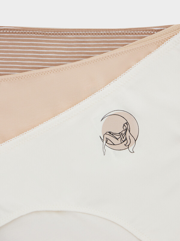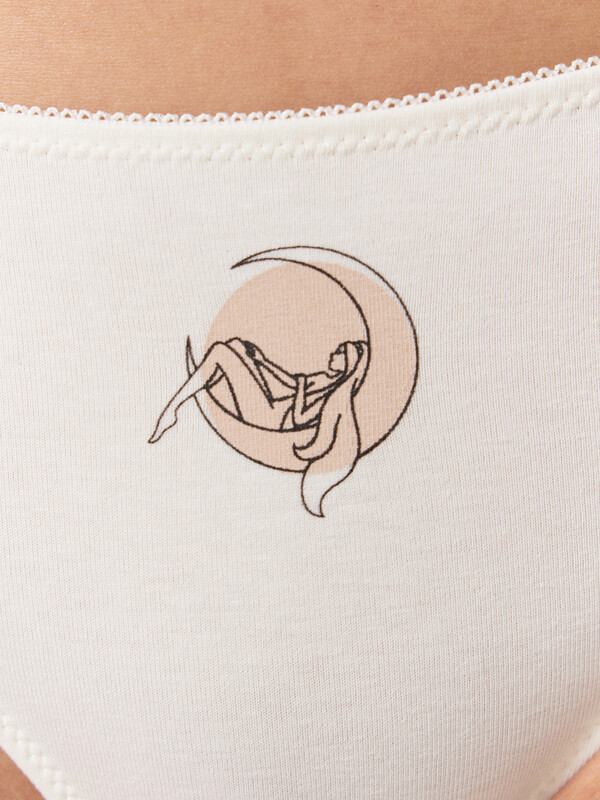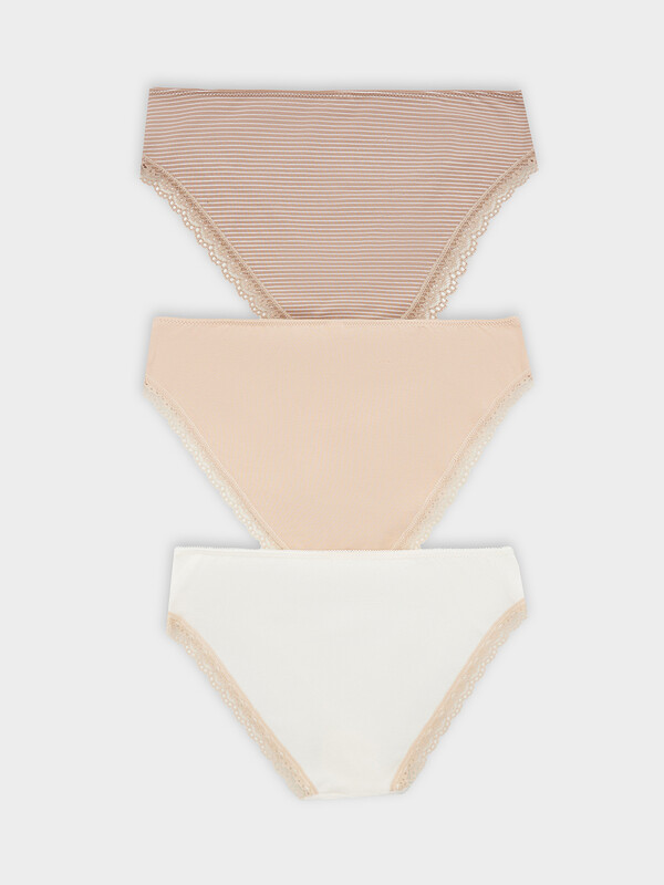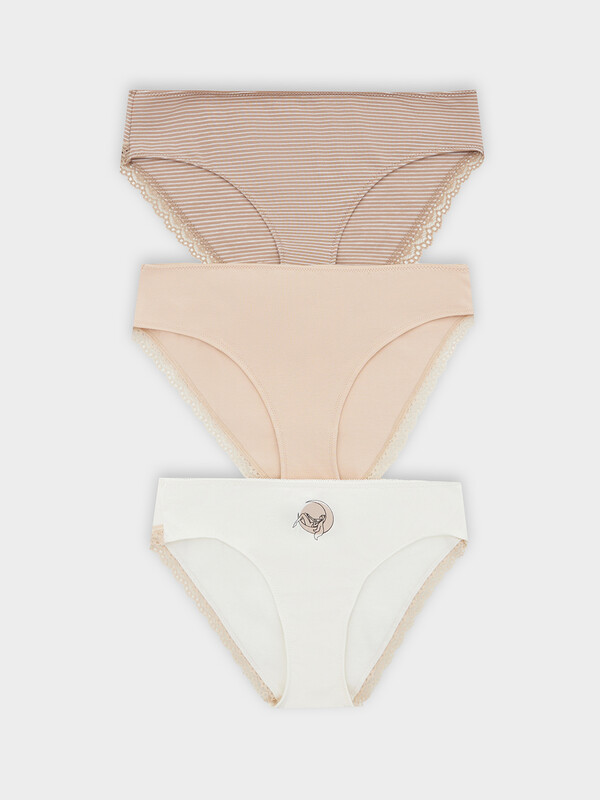 Классические трусики из натурального хлопкового полотна. Традиционная линия талии. Верхний срез трусиков обработан швом вподгибку, нижние передние – тесьмой, а задние декорированы узкими полосками из нежного кружева. Классика с изюминкой!