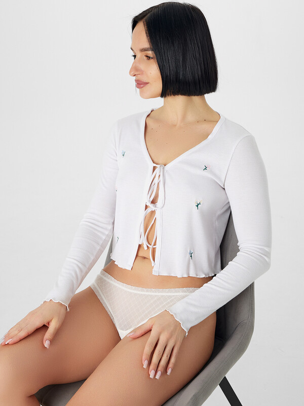 Трусы женские, средняя линия талии, силуэт - бразилиано. Передняя и задние детали выполнены из сетки. Подкладка ластовицы из хлопка, верхний срез подкладки ластовицы отлетной. По верхнему срезу трусов и по ножкам рюша из сборки, под низом жилка.