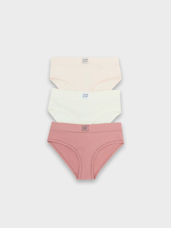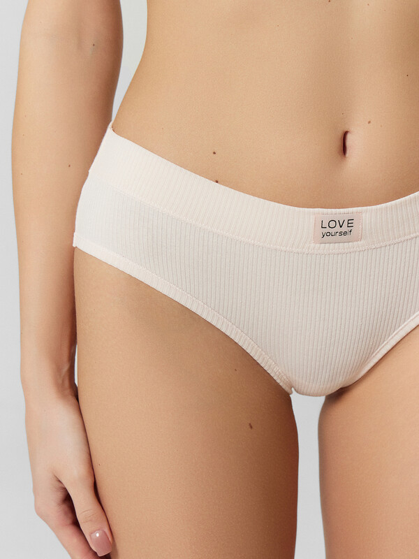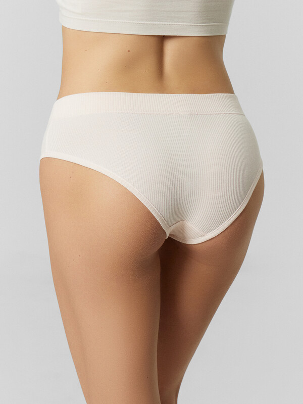 Трусы женские, средняя линия талии, силуэт - слипы. Передняя и задняя детали выполнены из рибаны. Верхний срез трусов обработан бейкой поперечной из рибаны, внутри жилка 6мм. Нижние срезы обработаны бейками поперечными из рибаны. Подкладка ластовицы из хлопка, отлетная по верхнему срезу.