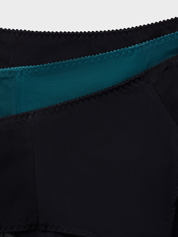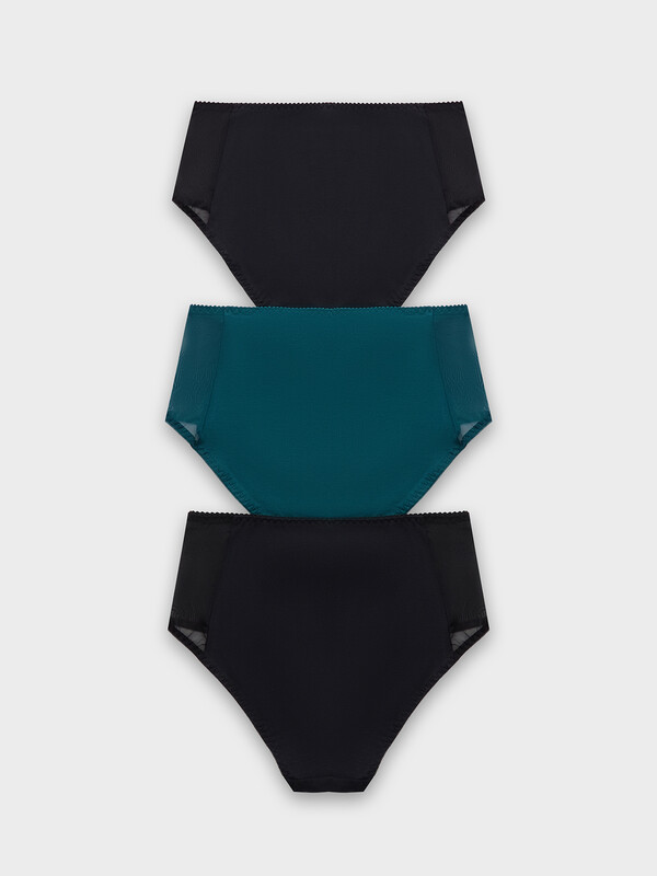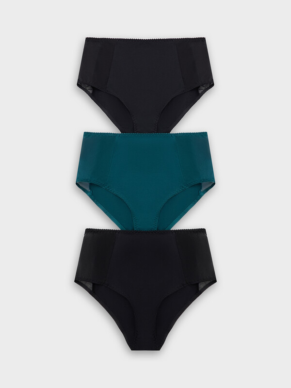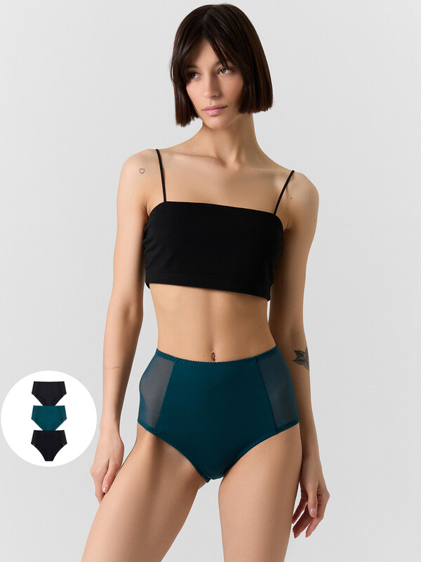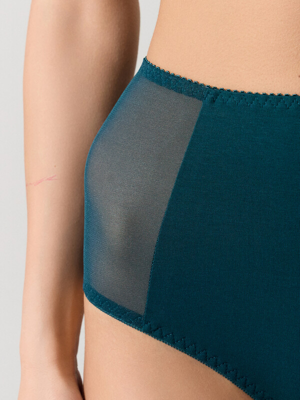 Трусы женские макси с высокой посадкой из кулирной глади. Передняя деталь из хлопка, с отрезными бочками, переходящими на заднюю деталь. Бочки выполнены из эластичной сетки. Задняя деталь из хлопка. Подкладка ластовицы из хлопка, отлетная по переднему краю. Талия обработана жесткой эластичной тесьмой с зубом в один прием. Ножки обработаны эластичной тесьмой.