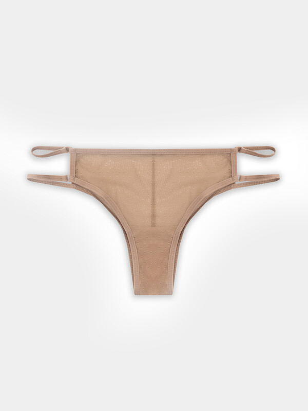 Интригующие женские бразилиана с классической линей талии. Трусики выполнены из ультралегкого полупрозрачного сетчатого полотна. Срезы бразилиана обработаны тесьмой. Изюминкой трусиков являются вырезы в боковых частях. Очаровательно!