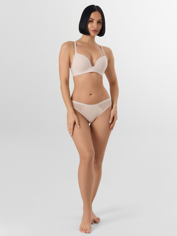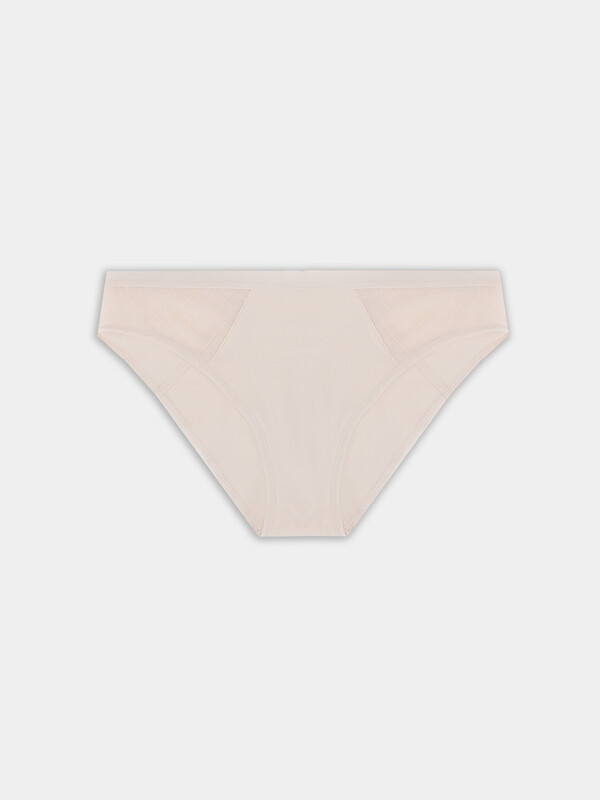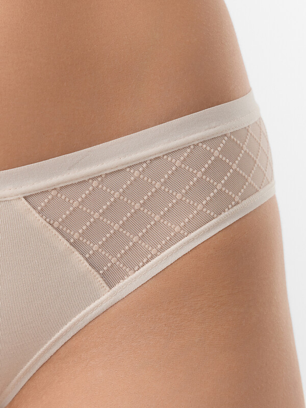 Трусы имеют классический силуэт слипы с удобной средней посадкой, которая комфортно сидит на талии и бедрах, не сползая и не создавая дискомфорта. По бокам модель украшена вставками из легкой сетки — это добавляет образу изящности, тонкости и обеспечивает дополнительную вентиляцию. Все края изделия, включая пояс и окантовку, обработаны мягкой эластичной тесьмой, которая предотвращает натирание, обеспечивает аккуратное прилегание и сохраняет форму трусов в течение всего дня.