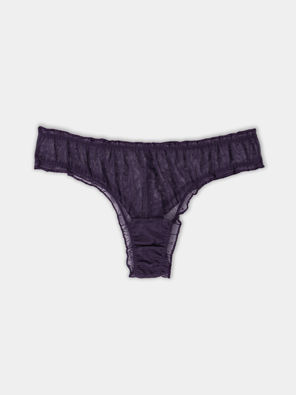 Трусы женские, средняя линия талии, силуэт - бразилиано. Передняя и задние детали выполнены из сетки. Подкладка ластовицы из хлопка, верхний срез подкладки ластовицы отлетной. По верхнему срезу трусов и по ножкам рюша из сборки, под низом жилка.