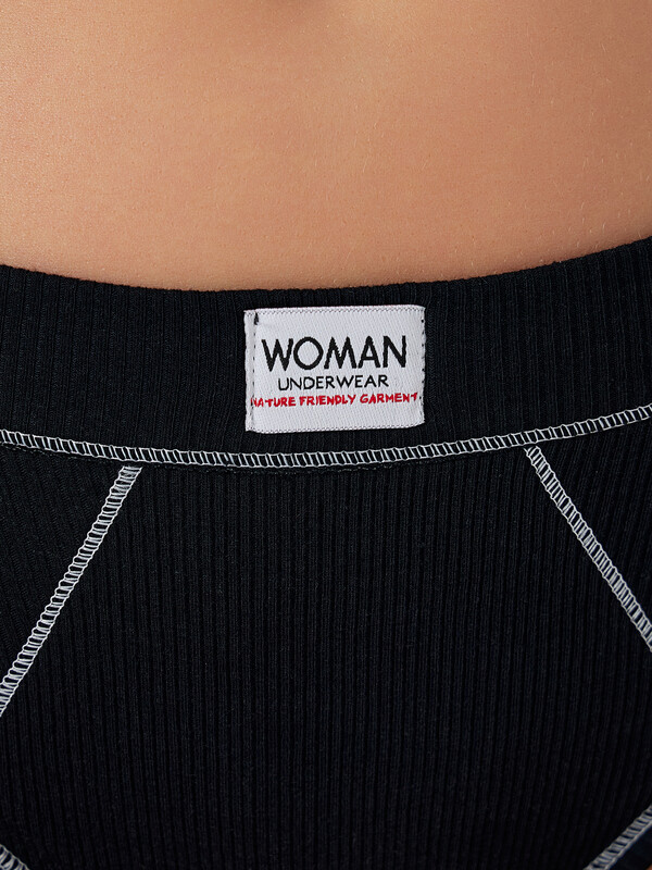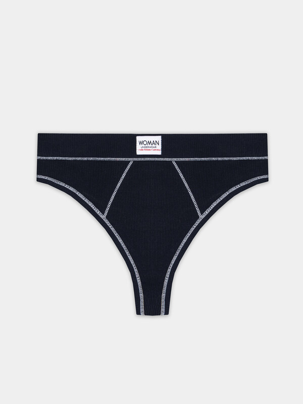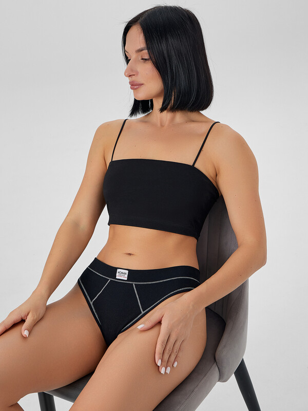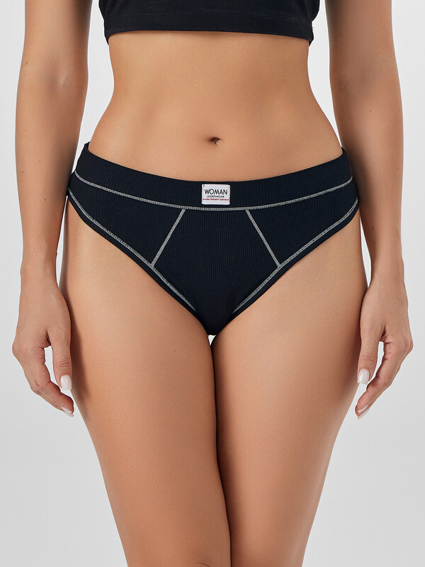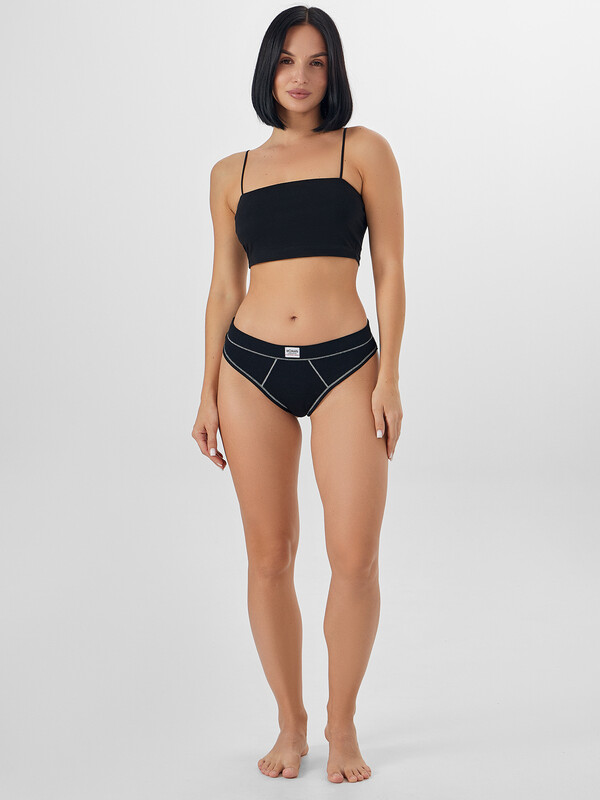 Трусы женские, средняя линия талии, силуэт - бразилиано. Передняя и задняя детали выполнены из рибаны. Верхний срез трусов обработан бейкой поперечной из рибаны, внутри жилка 6мм. Нижние срезы обработаны бейками поперечными из рибаны. Подкладка ластовицы из хлопка, верхний срез ластовицы притачан к детали из рибаны (с изнаночной стороны имитация мужского гульфика, с лицевой стороны декоративные строчки).