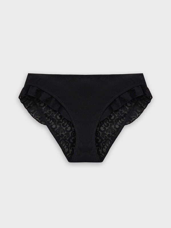 Трусы женские, средняя линия талии, слипы. Передняя и задняя детали выполнены из кружевного полотна. Рюша из кружевного полотна. Подкладка ластовицы из хлопка, отлетная по верхнему срезу. Верхний срез обработан тесьмой с зубом. Нижние срезы обработаны жилкой 6мм. Край рюши обработан закруткой.