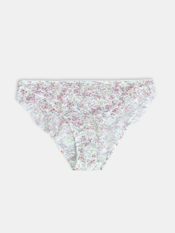 Трусы женские, средняя линия талии, слипы. Передняя и задняя детали выполнены из кружевного полотна. Рюша из кружевного полотна. Подкладка ластовицы из хлопка, отлетная по верхнему срезу. Верхний срез обработан тесьмой с зубом. Нижние срезы обработаны жилкой 6мм. Край рюши обработан закруткой.