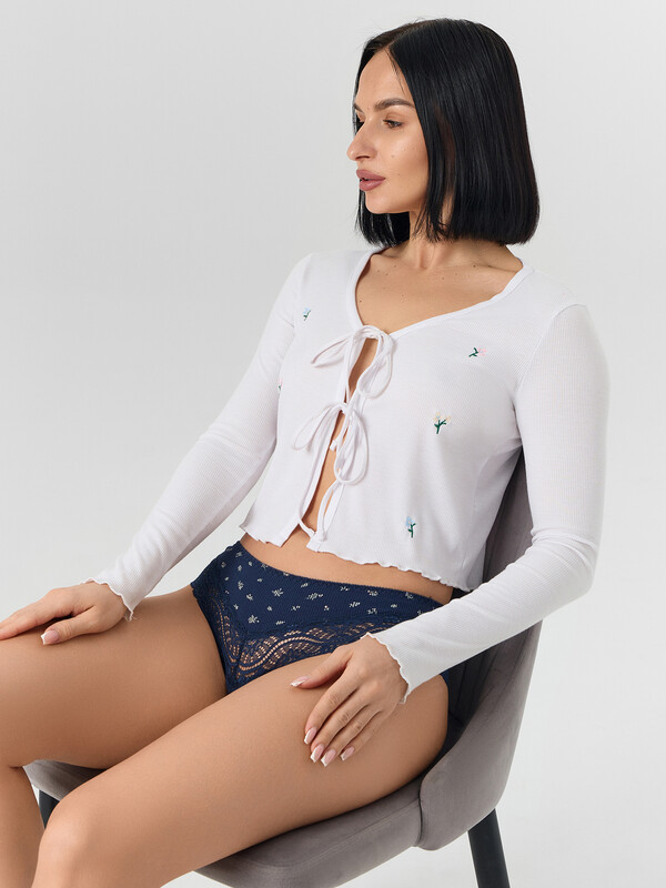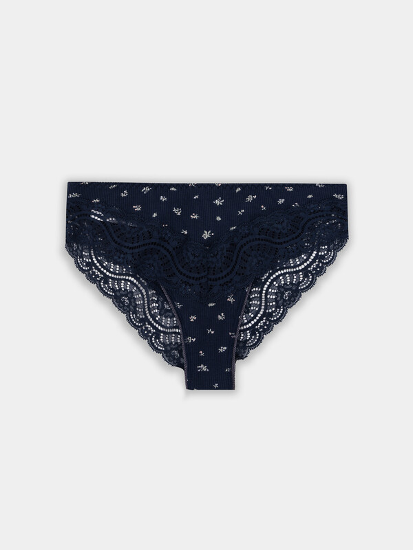 Трусы женские силуэта слип со средней посадкой из рибаны. По талии эластичная тесьма с зубом настрочена на 4-укольном зигзаге. Ножки обработаны узким кружевом шириной, на передней и задней частях со средним швом. Подкладка ластовицы из кулирной глади. Срезы ластовицы обработаны эластичной тесьмой с зубом на п/ш с изнаночной стороны.