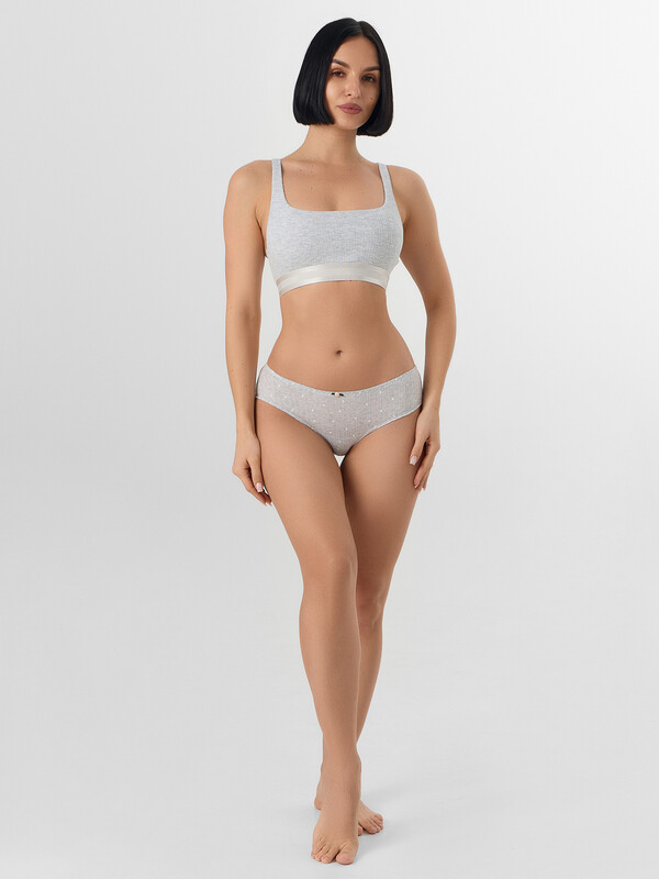 Трусы женские шорты со средней посадкой из рибаны. Передняя деталь цельная. Задняя деталь со средним швом, по ножкам узкое кружево шириной. Нижняя ластовица отлетная по переднему срезу, выполнена из кулирной глади. По талии тесьма эл с зубом настрочена на 4-укольном зигзаге.. Ножки обработаны на плоскошовной машине без эластичной тесьмы.