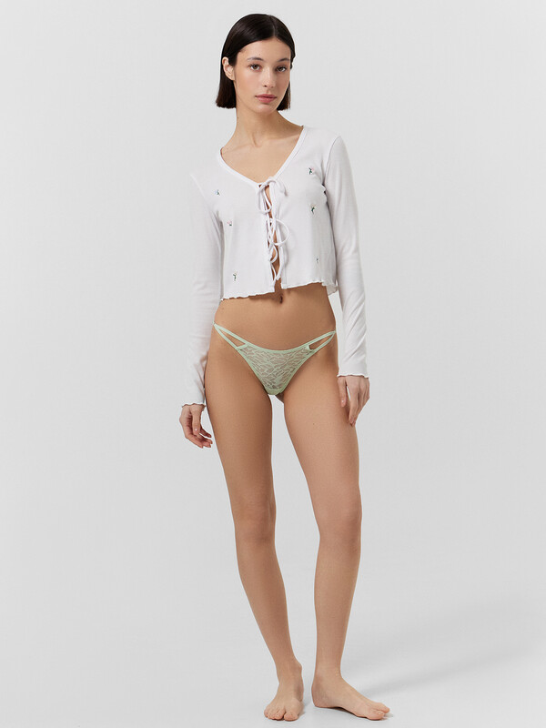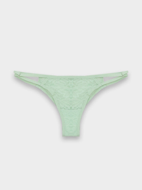 Трусы женские, силуэт бразилиано, из эластичного кружевного полотна, со средней посадкой. Передняя деталь цельная из кружевного полотна. Подкладка ластовицы из кулирной глади, отлетная по переднему срезу.