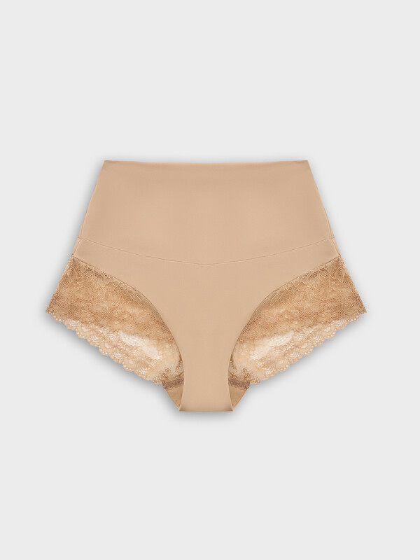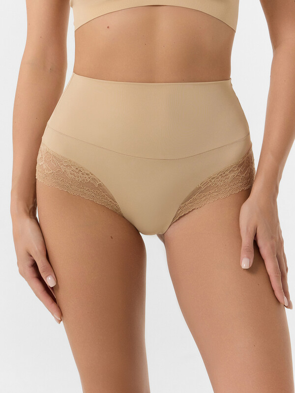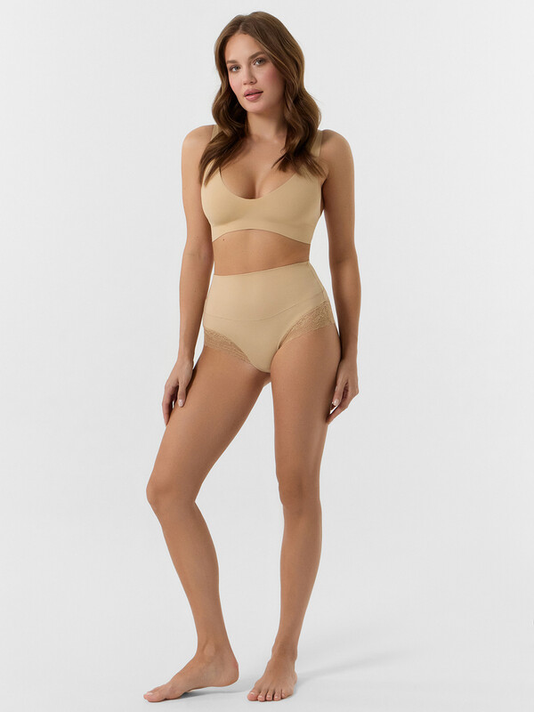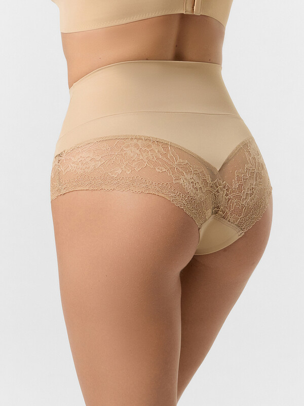 Трусы женские корректирующие с высокой посадкой, из эластичного кружева и трикотажного полотна микрофибры. Верхние детали из микрофибры соединены между собой ширителем, нижние детали из кружева. Верхняя часть двойная, со сгибом по талии. Подкладка ластовицы выполнена из кулирного полотна, отлетная по переднему краю. По срезам ластовицы жилка 6мм. внутри (WT4-6).