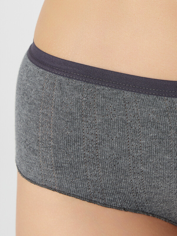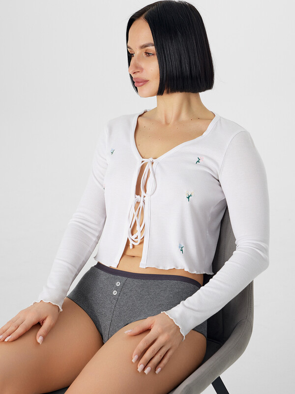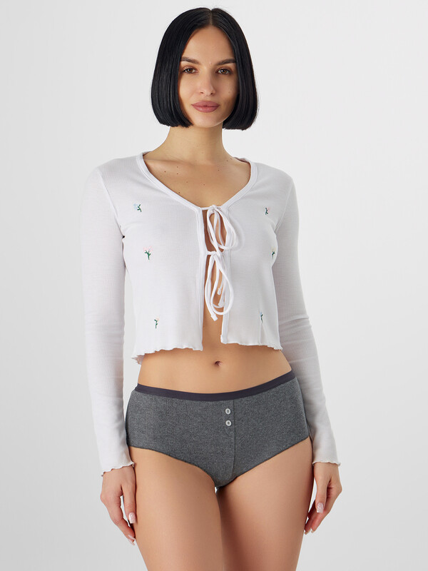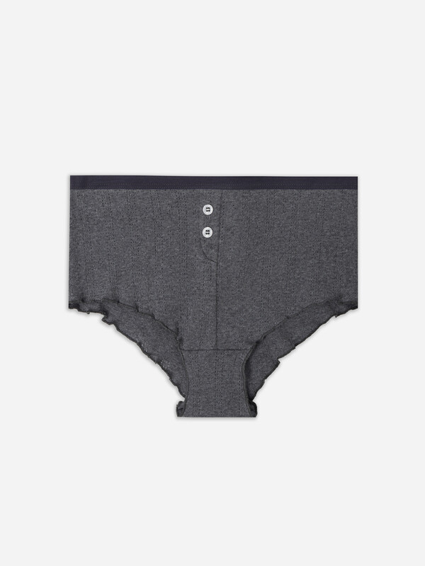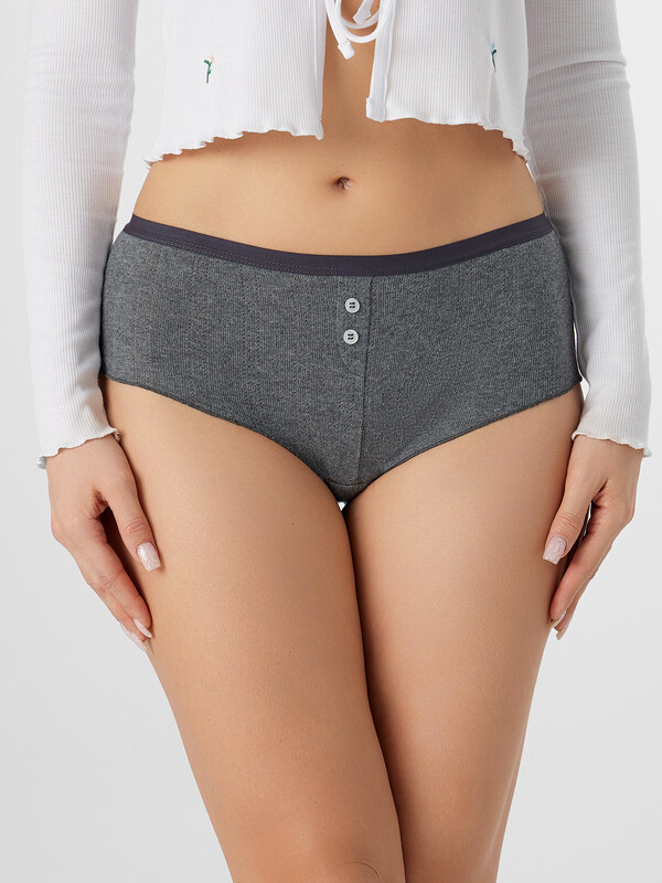 Трусы женские, силуэт шорты, из рибаны, со средней посадкой. Передняя деталь со средним швом, декорирована планкой с пуговицами (D= 10 мм, 2 шт). Подкладка ластовицы из кулирного полотна. Отрезная. Задняя деталь со средним швом. Верхний срез обработан жилкой 15 мм (WT4-15, Devsel 13195W). Нижние срезы обработаны на микрооверлоке (закрутка).