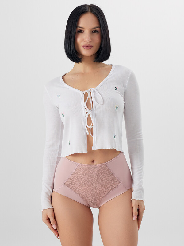 Трусы женские, силуэт макси, выполнены из трикотажного полотна микрофибра. Передняя деталь в центре декорирована кружевным полотном, на подкладке из монокапрона. Нижние детали переда двойные. Внутри по ножкам стоит эл тесьма 6мм (жилка Wt4-6, девсел 13460W). Подкладка ластовицы выполнена из кулирного полотна. Швы передних деталей, ластовицы обработаны на плоскошовной машине с верхним застилом. Срезы по ножкам зад. дет., ластовице обработаны эл. тесьмой с зубом 10мм (жесткая c/з WTE1-10 devsel 558W ) зигзагообразной строчкой. По верхнему срезу эл. тесьма 12мм (жесткая с/з WTE1-12, devsel 558W).