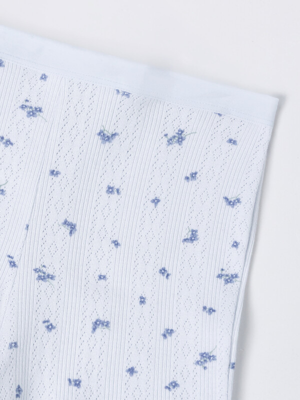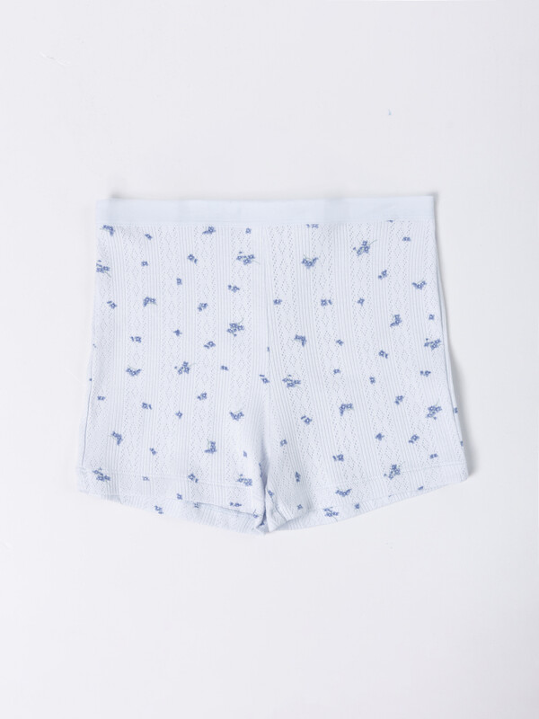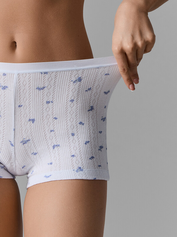 Трусы женские шорты, со средней посадкой, выполнены из рибаны. Подкладка ластовицы ромбовидной формы выполнена из кулирного полотна, отлетная по периметру. Нижние срезы обработаны швом в подгибку на п/ш машине. По веерхнему срезу настрочена эл тесьма 20 мм (жилка тканая с принтом WT7-20, девсел 13999BW).
