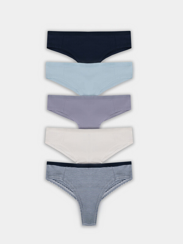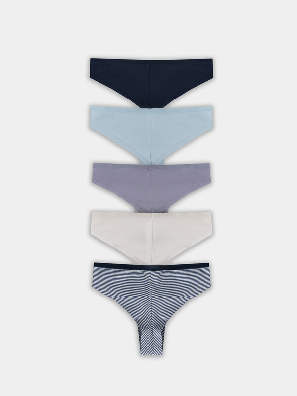 Мультипак (5 штук) хлопковых трусиков-бразилиана из натурального, гипоаллергенного, дышащего полотна. Линия талии занижена. На верхнем срезе – тонкая эластичная тесьма, по ножкам – шов вподгибку. Почти не заметны под одеждой!