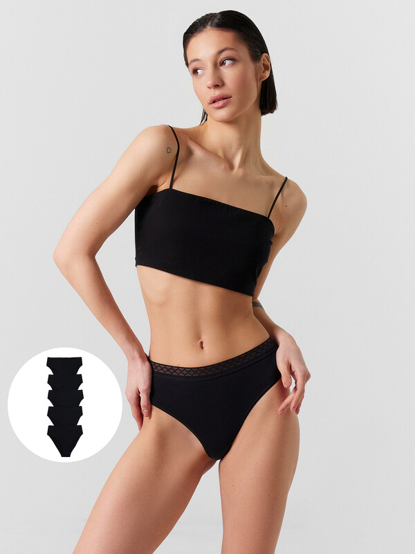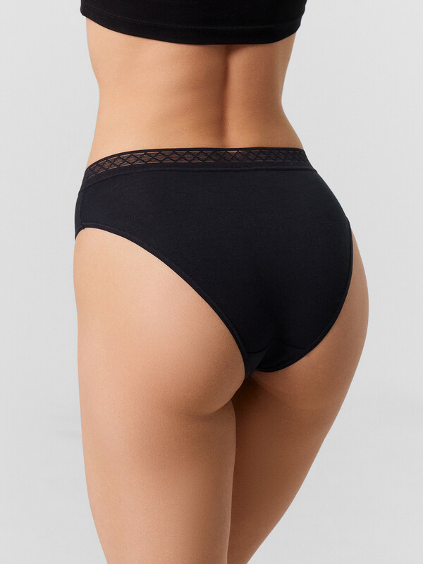 Слип-бикини из натурального хлопкового полотна – гипоаллергенного и приятного на ощупь. Линия талии завышена, бедра открыты. Верхний срез обработан декоративной тесьмой, по ножкам – жилка. Базовая расцветка!