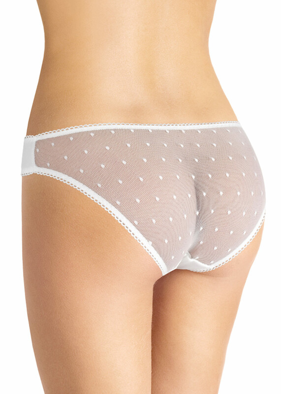Бикини из комбинированного полотна: деталь переда - однотонный хлопок, спинка - сетка. По ножкам и талии обработаны резинкой с фестоном. Спереди по центру расположен небольшой атласный бант.