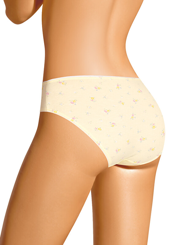 Трусы бикини женские из эластичного хлопкового полотна. Обработка краев по талии и ноге - резинка с кантом. По переду вставки из узкого кружева, атласный бант.