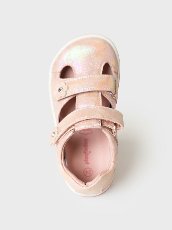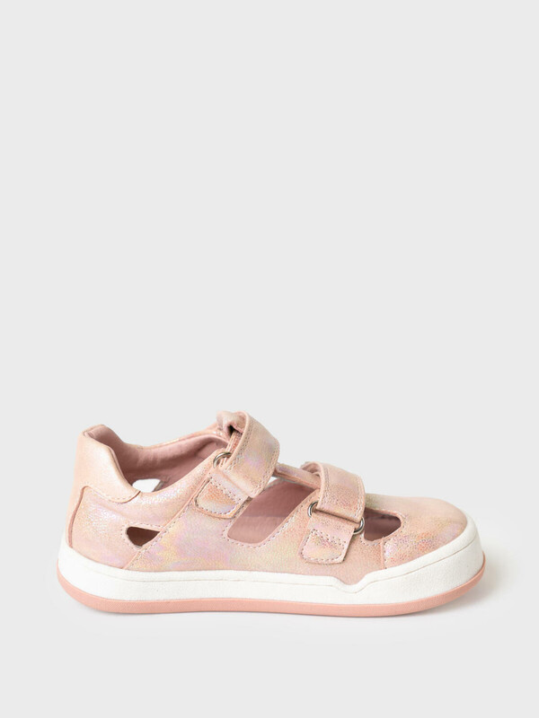 Сандалии для девочки с закрытой носочной и пяточной частью выполнены из перламутровой искусственной кожи. Удобные ремни с липучкой позволяют регулировать обувь на любой подъем и позволяют ребенку обуваться самостоятельно. Подкладка выполнена из натуральной свиной кожи. Стелька выполнена из натуральной кожи. Подошва из ТПР гибкая и нескользкая. Подошва дополнительно прошита по бортику для дополнительной прочности и гибкости. Парфюмированная подошва имеет запах жевательной резинки. Модель выполнена по технологии BAREFOOT (босоногая обувь): широкая носочная часть повторяет естественную форму стопы ребенка, легкая, гибкая и хорошо амортизирующая подошва, специальный рисунок протектора подошвы, имитирующий присоски осьминога для лучшего сцепления с дорогой.
