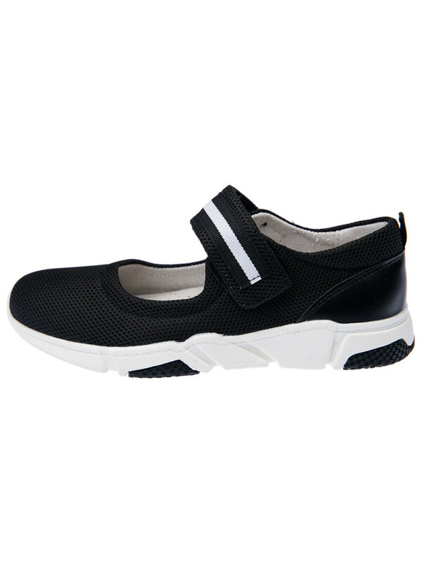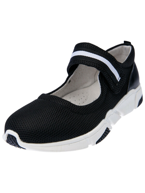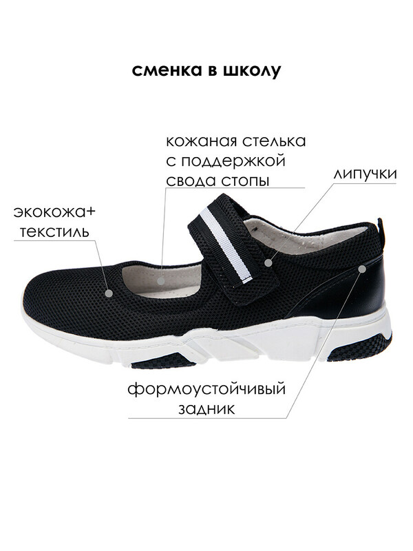 Эти черные подростковые туфли для девочек подойдут как сменная обувь в классе, а также для прогулок в сухую погоду — весной, летом и ранней осенью. Модель удобна в течение всего дня: ребёнку будет комфортно и на уроках, и во время перемен.