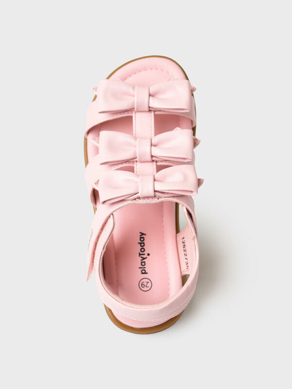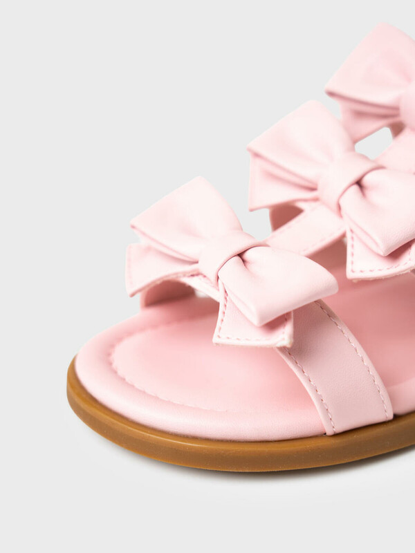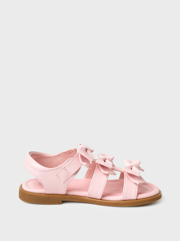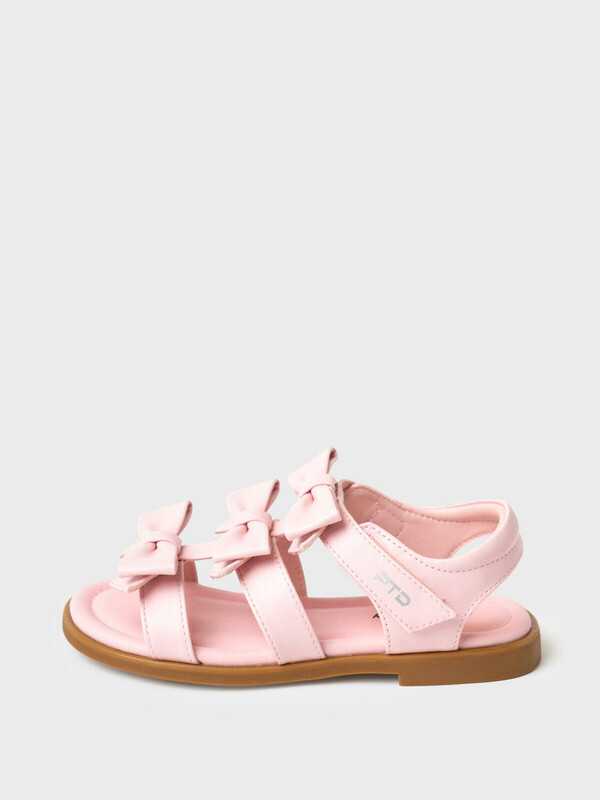 Стильные босоножки с бантиками для маленьких принцесс. Сандалии выполнены из искусственной кожи. Удобная застежка липучка. Мягкая деталь на пяточном ремне. Подошва из резины очень гибкая.