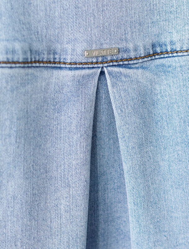 Укороченная рубашка светло-голубого цвета выполнена из облегченного денима плотностью 8 OZ.  Джинсовая легкая рубашка идеально подходит для весны и лета. После пошива изделие подвергли специальному виду вошинга — salt-stone washing (солт-стоун вошинг), что дословно значит стирка с каменной солью. Такой вид вошинга позволяет получить стильные потертости на голубых оттенках денима. На кармане выполнена вышивка по авторскому эскизу дизайнера — буквы V L T, оформленные вензельным шрифтом. Сама вышивка выполнена техникой «застил» машинным способом. Свободная рубашка отлично подходит для создания летних образов или стильных ансамблей на каждый день засчет своей универсальности. Отложной воротник создает аккуратный внешний образ.  Широкий рукав средней длины гарантирует свободу движений и удобство на весь день.  Джинсовую блузку можно сочетать в стиле кэжуал, а также создавать монохромные образы или добавлять яркие акценты с помощью аксессуаров. Эта укороченная блузка на пуговицах станет базовым элементом гардероба