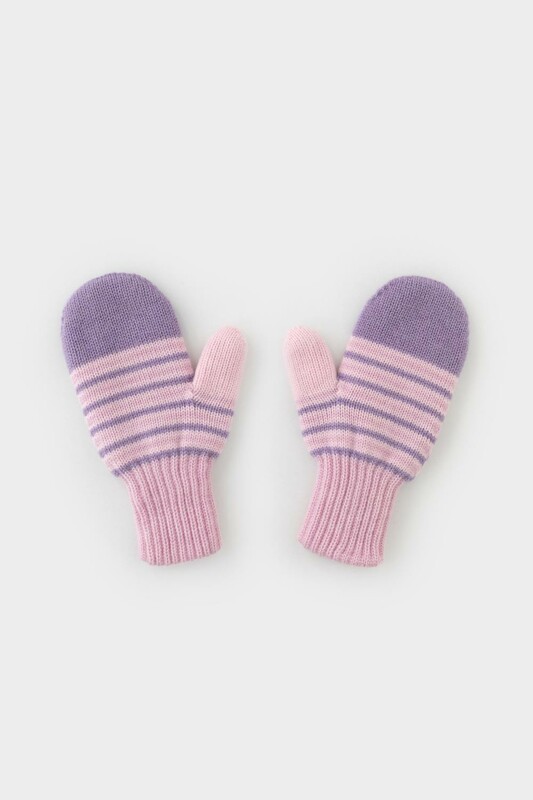 Варежки в полоску из полушерстяной пряжи. Эластичные манжеты фиксируют перчатку на руке.
