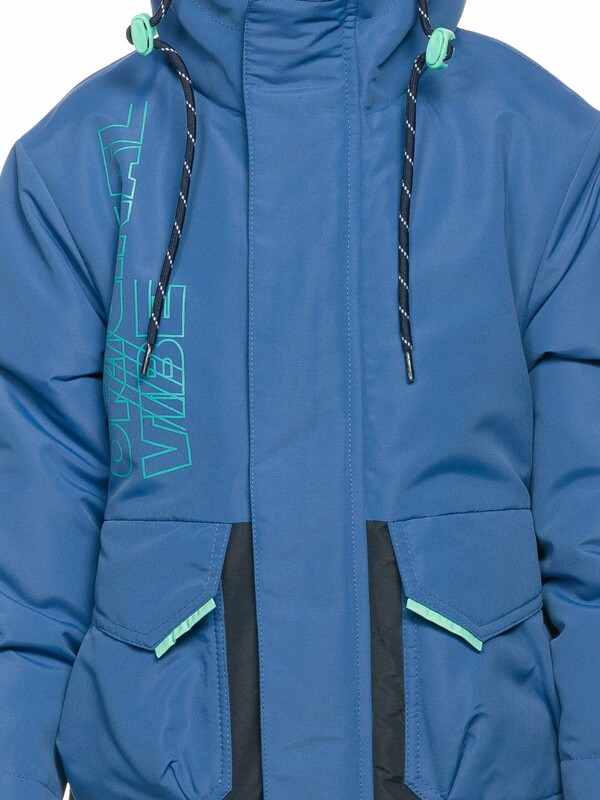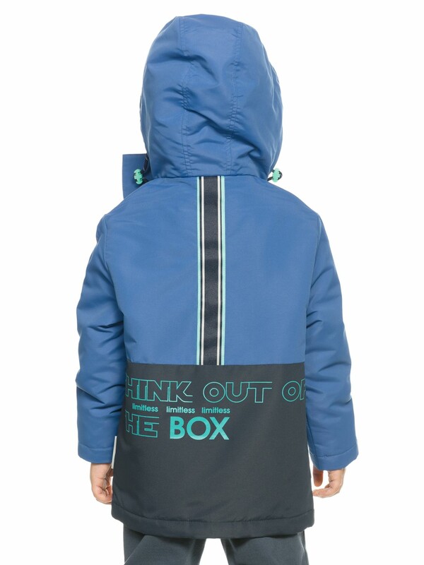 Утеплённая ветровка для мальчиков. Рекомендуемый температурный режим не ниже +5°С. Курточная ткань с двусторонним водоотталкивающим покрытием. Многозональный подклад флис в капюшоне и по стану, утеплитель из легкого синтепона 40 г/м2 в рукавах и ниже линии талии. Прямой удлинённый силуэт. Двухшовный неотстегивающийся капюшон с регулировкой объема шнурком и контрастного цвета стоппером. Воротник стойка из основной ткани застёгивается на липу. На воротнике защита подбородка и шеи от защемления молнией. Внутренний воротник стойка как в куртке бомбере и внутренние манжеты рукавов из рибаны. На передней части изделия широкая планка, застегивающаяся на липы. Застежка тракторная молния, разъёмная сверху и снизу. Накладные карманы с клапанами с втачными декоративными элементами, на спинке настрочена контрастная декоративная тесьма, в боковых швах по низу расположены светоотражающие элементы, шрифтовые принты контрастного цвета на переде Оригинальная атмосфера, на спинке Выходи за рамки или Мысли нестандартно досл. Думай за пределами коробки + limitless безграничный.