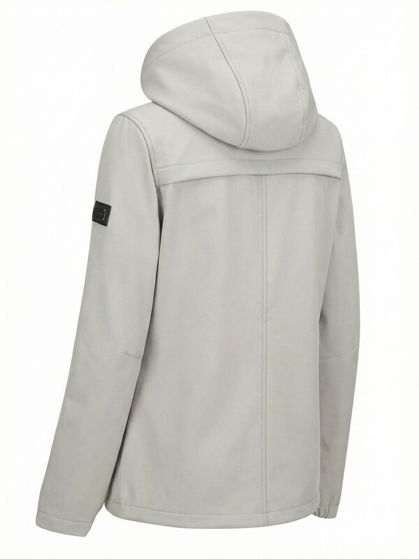 Ветровка женская софтшелл виндстоппер с капюшоном спортивная серого цвета 9612_1Sr
