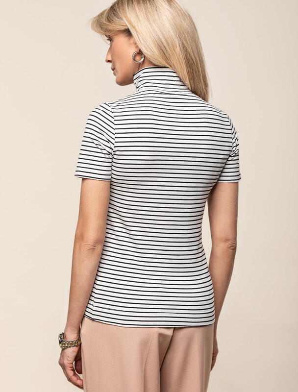 Водолазка с коротким рукавом выполнена из премиального хлопка с добавлением эластана. Гладкий трикотаж обеспечит гарантированный комфорт и удобство в использовании. Внизу изделия металлическая нашивка с логотипом бренда. Совет стилиста: водолазка может заменить рубашку в нестрогом офисном образе или подружиться с джинсами-трубами, жилетом и кедами в расслабленном повседневном наряде.