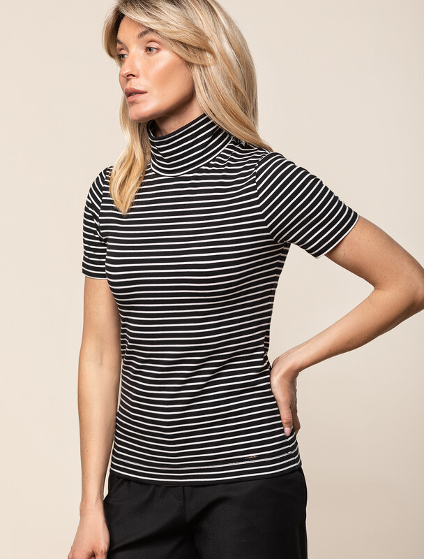 Водолазка с коротким рукавом выполнена из премиального хлопка с добавлением эластана. Гладкий трикотаж обеспечит гарантированный комфорт и удобство в использовании. Внизу изделия металлическая нашивка с логотипом бренда. Совет стилиста: водолазка может заменить рубашку в нестрогом офисном образе или подружиться с джинсами-трубами, жилетом и кедами в расслабленном повседневном наряде.