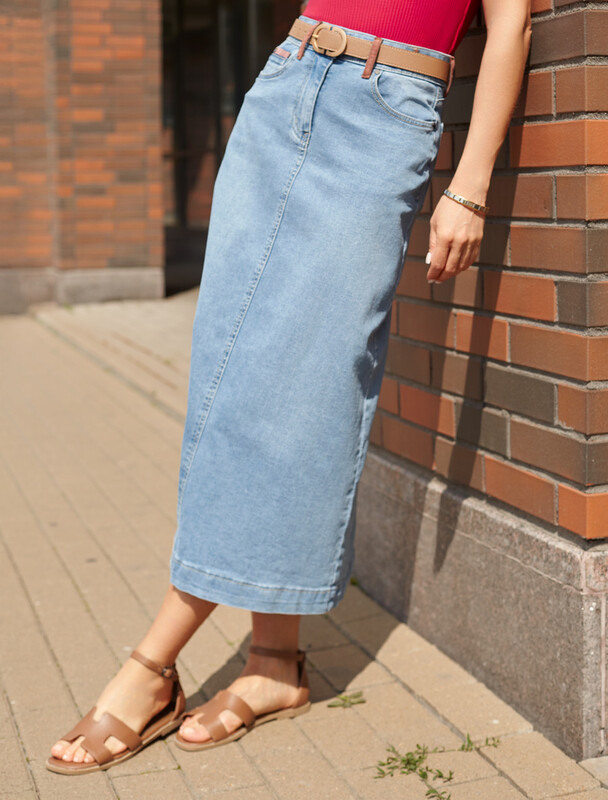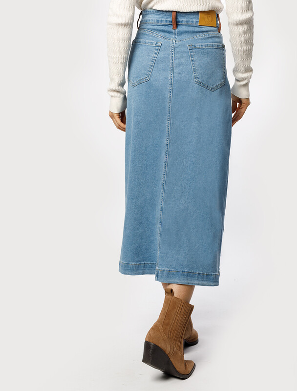 Юбка А-силуэта выполнена из эластичного денима. Модель средней посадки с декоративными потёртостями и пятью карманами как у джинс. Подходит для любого типа фигуры. Сочетается с открытой обувью, кроссовками и сапогами. Изделие дополнено фирменным патчем.