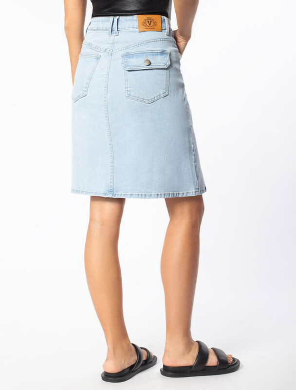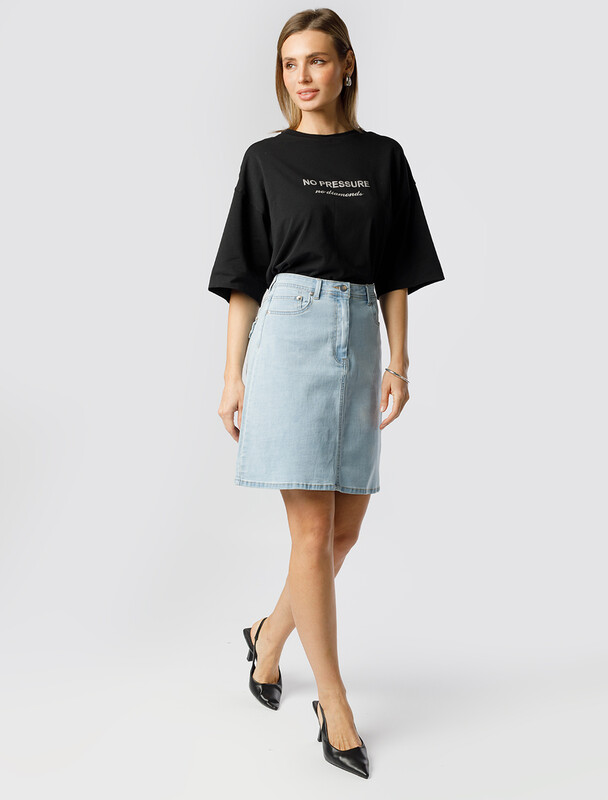 Юбка А-силуэта с декоративной стиркой выполнена из эластичного денима. Модель дополнена пятью карманами как у джинс и брендированным патчем на поясе. Правый задний карман с клапаном. За счет эластана изделие хорошо тянется и гарантирует комфорт и формоустойчивость. Подходит для любой фигуры.