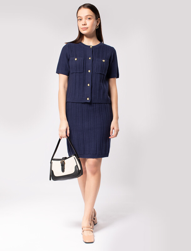 Юбка фактурной вязки выполнена из мягкой хлопковой пряжи с добавлением акрила. Изделие дополнено трикотажной подкладкой, в поясе вставлена эластичная резинка, что гарантирует абсолютный комфорт при носке. Сочетайте в костюме с жакетом D31.387 чтобы получить завершённый элегантный образ.